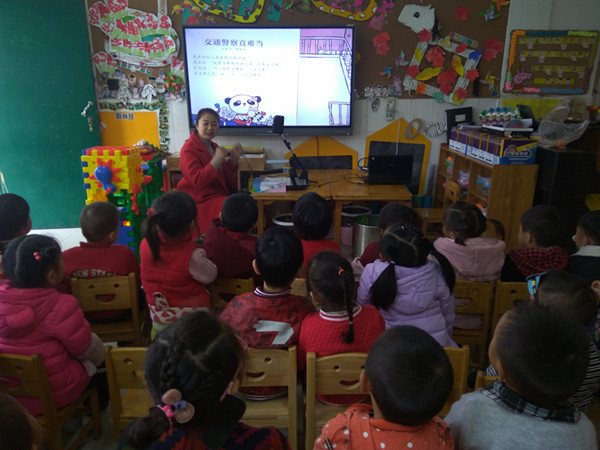 活动中,教师播放《交通警察真难当》故事的PPT,引导幼儿观察,并告诉幼儿过马路时要遵守交通规则“红灯停,绿灯行”。