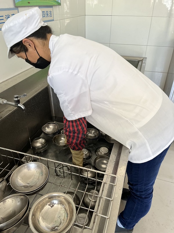 首先,对食堂的每个角落、地面进行了打扫,经过清洗、消毒、清洗后的地面干净、整洁。同时,食堂工作人员严格按照消毒步骤,对照配比浓度,调制消毒液对食堂菜篮、厨具灶台等进行全覆盖面的消毒。最后,孩子们的碗、勺、杯子等各种餐具,经过认真的清洗后,送进消毒柜高温消毒,确保幼儿用上干净、卫生的餐具,为就餐安全增加了一道防线。