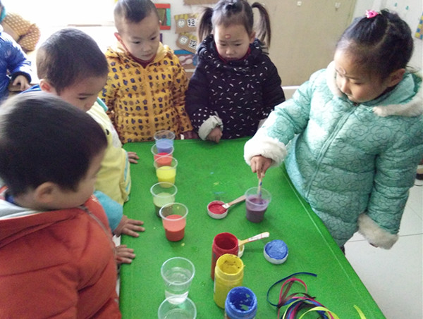在教师的指导和配合下,幼儿尝试自己调颜色,将彩色碎纸、彩色的吸管等放入水中,然后将装有水的纸杯放到室外去冰冻。
