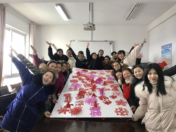 活动中教师纷纷发挥自己的才艺,首先一个立体剪纸“春”字,让每个教师根据图示剪纸,在教师的巧手下一个个立体“春”字油然而生。接着是教师们的自创剪纸,一把把小剪刀、一张张彩纸,在老师们的手中飞舞着。不一会儿,一张栩栩如生、活灵活现的艺术品便诞生了,“小雪花”“福”“鱼””……无不洋溢着欢快和吉祥的寓意。
