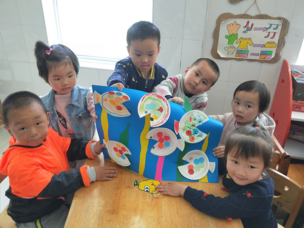 助教妈妈带来了一次性的纸盘、彩纸等材料,带领孩子们进行手工活动《五彩小鱼》。活动中小朋友大胆尝试,积极动手,用彩纸在纸盘上粘贴装饰,不一会儿,一条条五彩的小鱼就完成了!在助教妈妈的带领下,孩子们将五彩小鱼合作贴在背景板上,瞧,一片海洋世界出现在眼前!