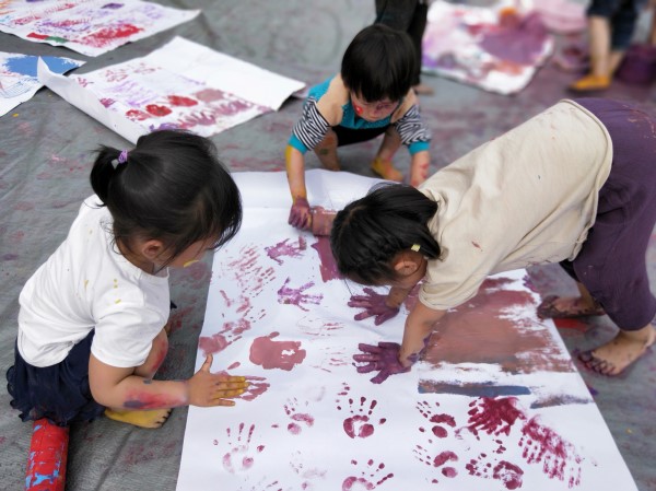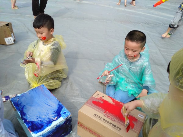 白色的帆布,彩色的世界,来了一群活泼可爱的孩子。看!他们光着脚丫,踩出了五颜六色的脚印,也踩出了他们多彩的童年!他们用自己的巧手,在追逐嬉戏中,绘出了他们五彩缤纷的世界!就连平时孩子们最爱玩的泡泡机也摇身一变成了五彩的画笔,不一会儿泡泡炸开啦,画纸上留下来孩子们梦幻的作品。孩子们沉浸在美的世界里,也对美术材料产生了浓厚的兴趣。