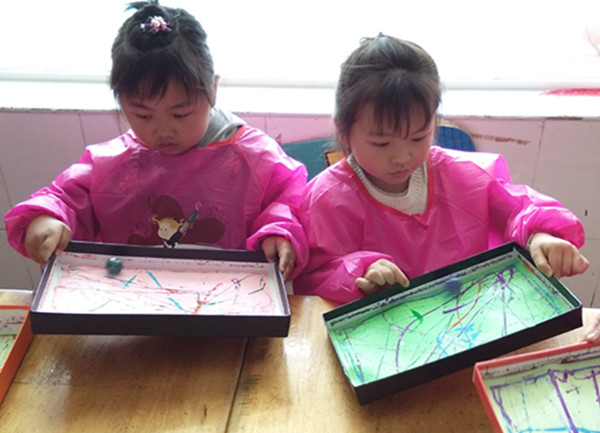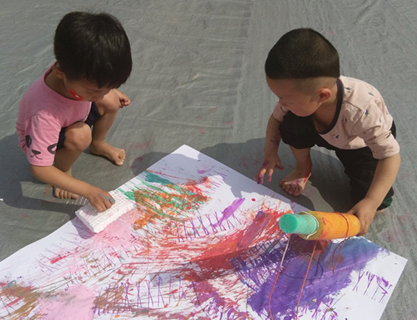 在玩色活动中,孩子们通过游戏的形式,利用一些废旧物品让幼儿进行玩色,如树叶、绳子、泡沫、纸团等,小朋友们充分感受了玩色工具的多变。印画、弹珠滚画、吹画、……让幼儿感受到了一种新鲜、好奇的体验,从而激发了他们对绘画活动的兴趣。