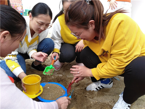 现场探究环节,老师们来到户外沙水区,利用亿童沙水区材料沙水游戏比拼赛,开展了“建构数字”、“穿越隧道”、“引水入渠”三个实操性体验游戏。三组的老师们分别通过合作探究、不断尝试来解决问题,亲身体验孩子探究游戏的过程。他们探索着如何运用多种材料在多孔板上安装连接管道,搭建排水渠道,再将水灌入后,利用阀门控制着水的流动轨迹。试验、调整、在试验多次,当水成功通过老师们搭建的“水利工程”时,老师们都像回到童年一般,快乐的体验着“沙水游戏”带来的无限乐趣。