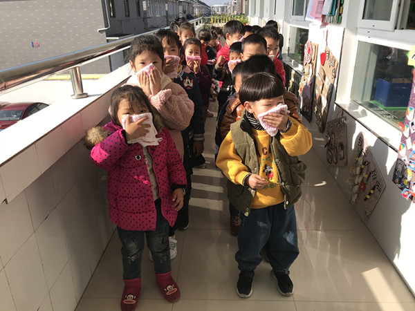 上午9:40分,消防警铃便传遍全园,听到警报后全园教职工立即停下手中的工作,各班教师迅速组织幼儿拿好湿毛巾,捂住口鼻,按紧急预案的疏散带领幼儿进行逃生。