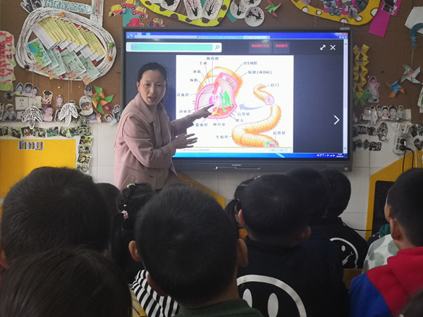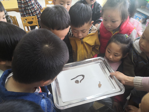 孩子们围着蚯蚓仔细观察,“蚯蚓吃什么呀?”“它有牙齿吗?”“蚯蚓会走路吗?”“它冷吗?”面对孩子的问题,老师先鼓励大家自己寻找答案。再利用集体活动给孩子们介绍了蚯蚓的种类、特征,生活习性等,让孩子们全面了解蚯蚓。