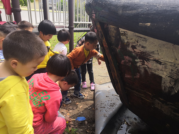 蚯蚓生活在哪里,怎样找到蚯蚓,孩子们开始了探究。不少小朋友拿来了挖泥的铲子、小铁锹、塑料盒,蹲在滑梯下、油桶边、大船旁、轮胎里寻找蚯蚓的踪迹,功夫不负有心人,经过不懈地努力,孩子们收获了四条蚯蚓。