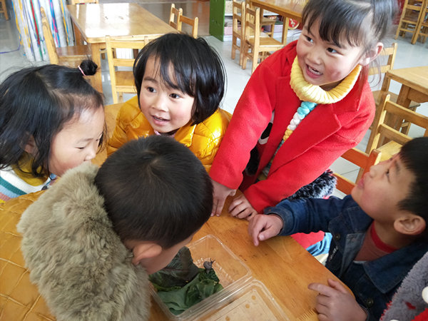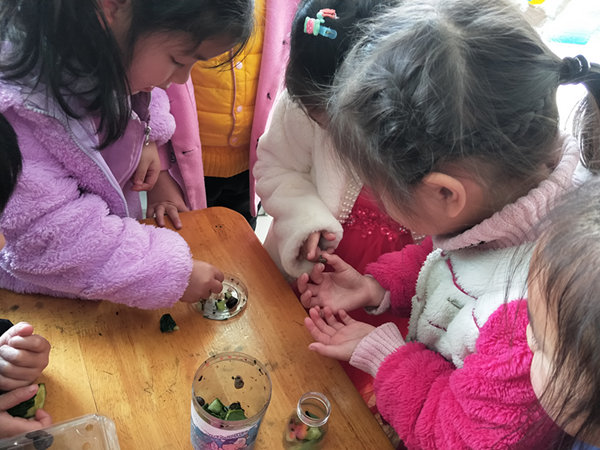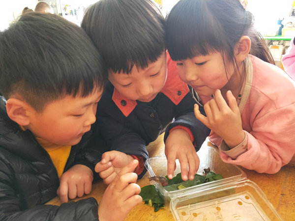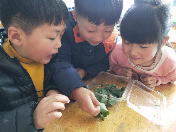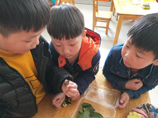 小朋友络绎不绝地说着自己的想法,于是老师决定让孩子们将自己猜想的食物都带来,喂给小蜗牛们吃,让孩子们观察蜗牛喜欢吃的东西,自己亲自找到问题的答案。