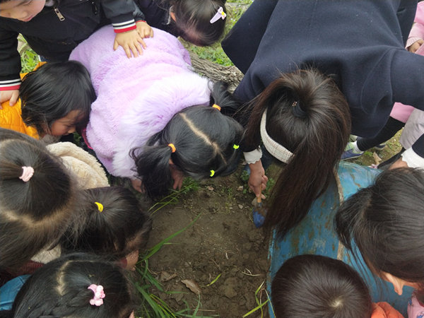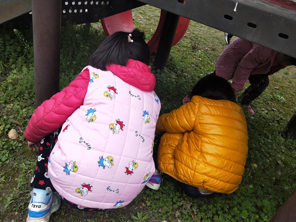 在一个晴朗的午后,孩子们来到了操场前的草地上寻找蜗牛。孩子们在种植区的菜叶边找,没有看到。旁边的草丛里,孩子们翻了又翻也是没有看到。