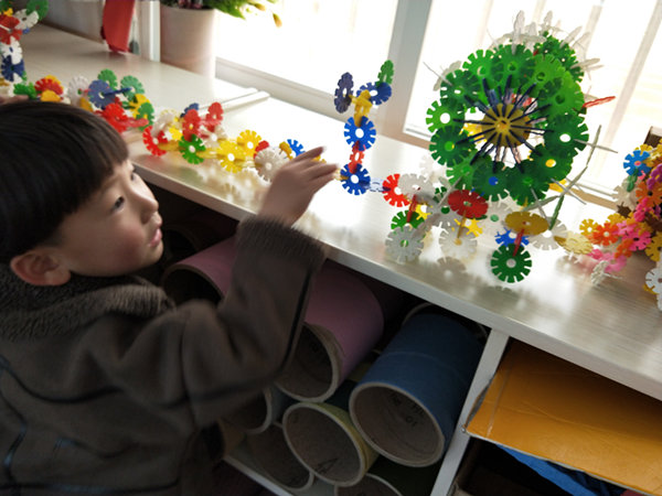 观察完蜗牛,来搭搭蜗牛吧。孩子们用小纸筒根据自己的想象用小纸筒搭建他们心中的蜗牛;再用雪花片搭建蜗牛,先搭出蜗牛的硬壳、再搭出蜗牛的身子,看看小朋友们搭建的蜗牛是不是跟真正的蜗牛十分相像呢?