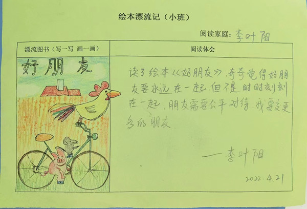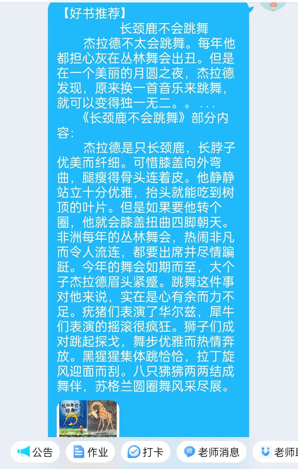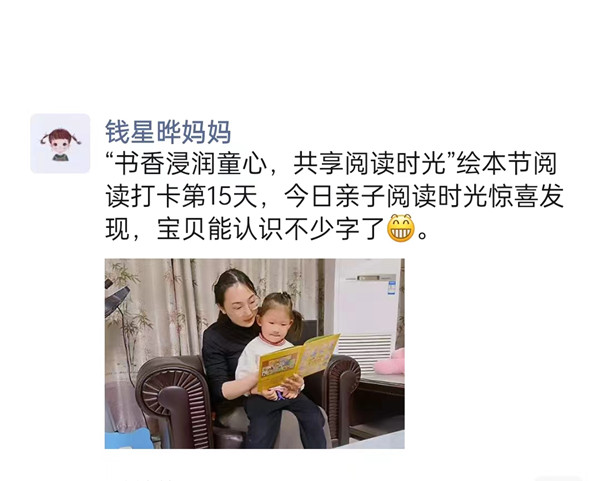 班级老师每日分享推荐一本绘本,由家长每天坚持陪伴孩子阅读绘本故事,与孩子共享亲子阅读时光,记录阅读体会。家长还通过各种方式,分享了孩子阅读的照片、视频,用心记录着孩子的成长点滴。