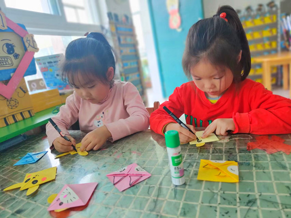 为激发幼儿阅读的热情,提高幼儿的动手创作能力,在孩子们的巧妙构思下,利用不同的方式,画一画,剪一剪,折一折,创作出各种各样的小书签,一举一动尽显小小艺术家的创作特色。瞧瞧,孩子们动手做起书签来多么认真!